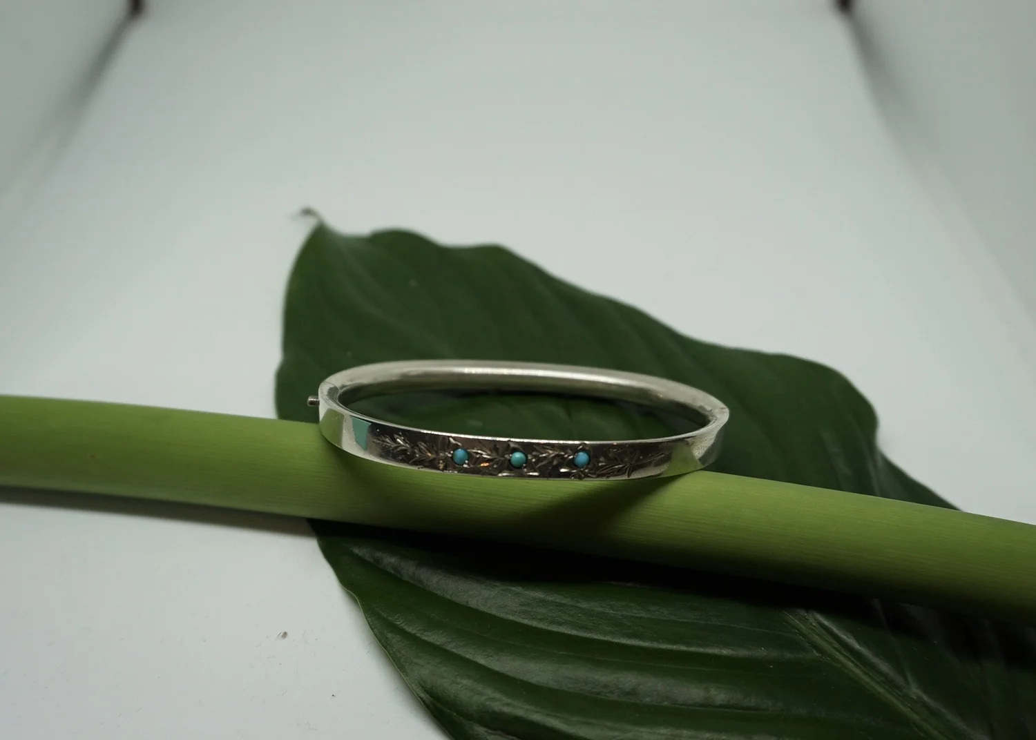 BRACELETS › Silver Bangle with Turquoise 1 / 3 Image 1 of 3 Image 2 of 3 Image 3 of 3 Silver Bangle with Turquoise $225.00 Sterling silver with Turquoise detailing and engravingCirca 1900Size 6 (Small)England Purchase Added! Sterling silver with Turquoise detailing and engravingCirca 1900Size 6 (Small)England